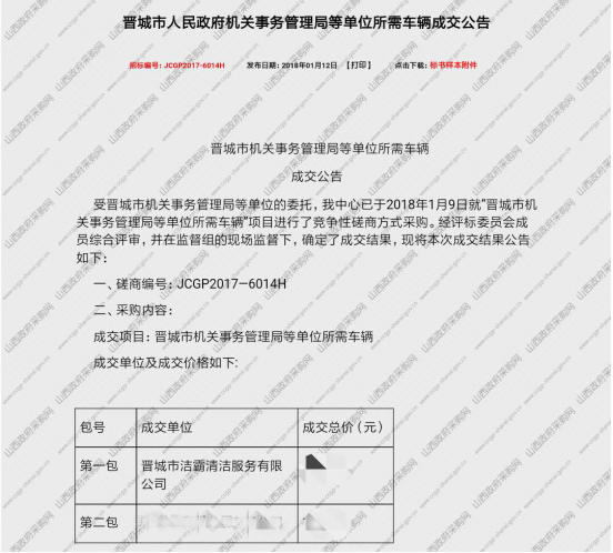 (1)晉城市人民政府機(jī)關(guān)事務(wù)管理局等單位所需車輛項(xiàng)目成交公告