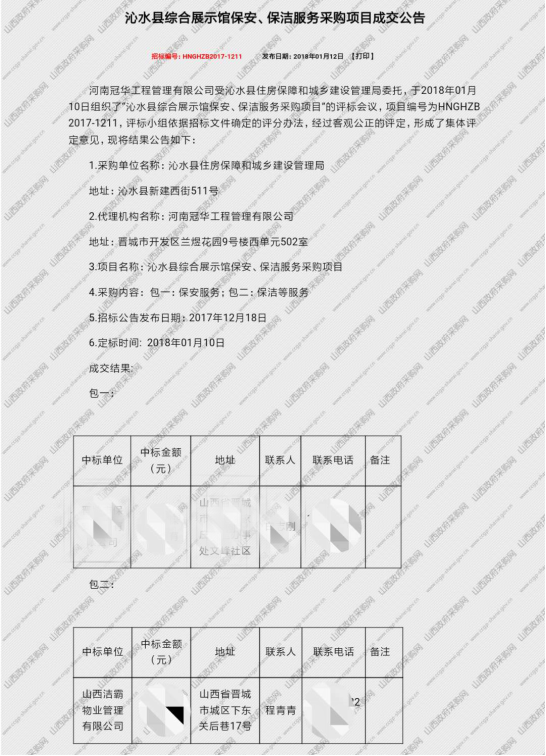(2)沁水縣綜合展示館保安、保潔服務(wù)采購(gòu)項(xiàng)目成交公告