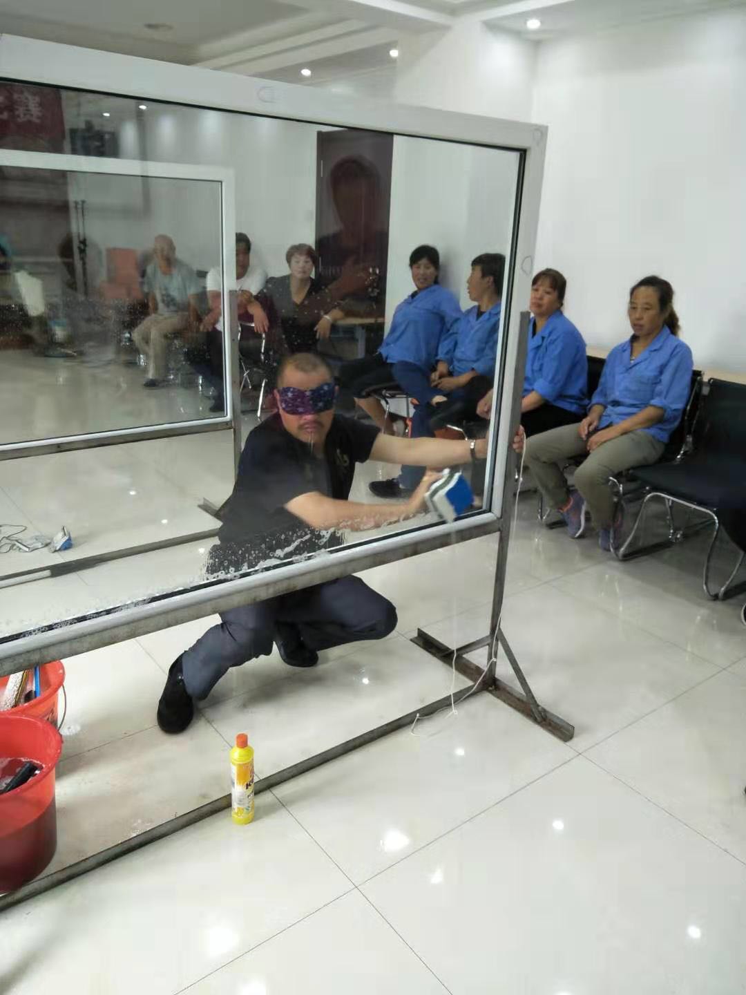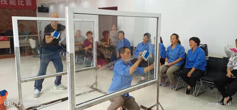 賽前,公司總經(jīng)理程晉軍、工會主席崔偉作了致辭動員。比賽選手個個摩拳擦掌,躍躍欲試。首先進(jìn)行的是洗地機(jī)障礙演示技能比賽,比賽過程中每個選手都能嫻熟地安全避過比賽設(shè)置的障礙并能按正規(guī)操作章程進(jìn)行,展示了過硬的操作技能;在高空外墻清洗安全防范實(shí)際演示過程中,穿工衣、帶安全帽、系安全繩以及放繩整個過程細(xì)致到位,一氣呵成;接著大家期盼的蒙眼擦玻璃賽將技能比賽推向了高潮,這是最富觀賞性的比賽,大家在佩服選手熟練的手法和技巧時,也對工程部對于服務(wù)質(zhì)量和技術(shù)的高要求感到敬佩。比賽中洋溢著歡歌笑語,公司副總經(jīng)理張永智對比賽進(jìn)行了實(shí)時精彩的點(diǎn)評。