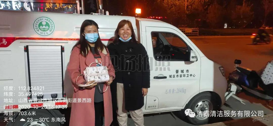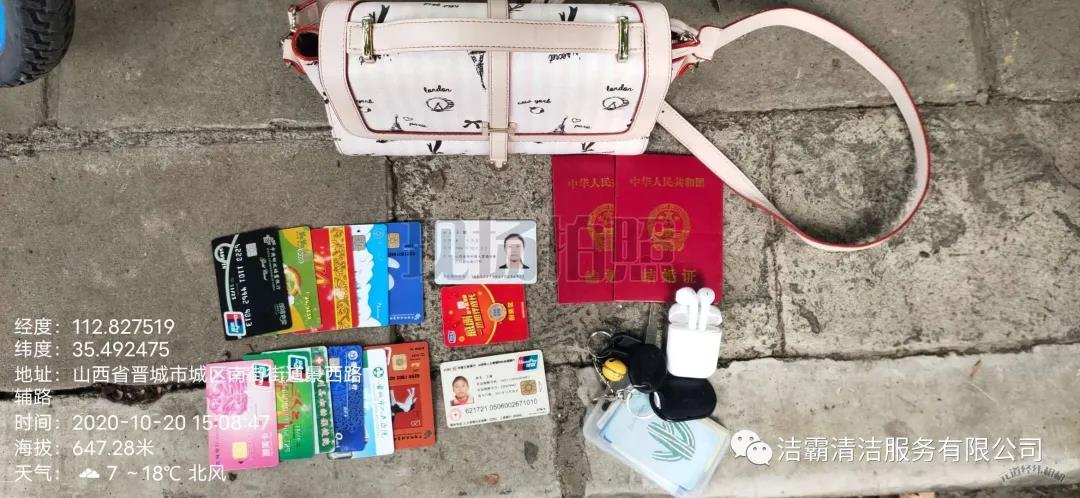 10月20日下午3點(diǎn)左右,晉城市潔霸清潔服務(wù)股份有限公司保潔部環(huán)衛(wèi)經(jīng)理李通和工人在城區(qū)南街街道景西路段進(jìn)行街道清洗作業(yè)時(shí),忽然看見(jiàn)晉城農(nóng)商銀行門前的綠化帶里有一個(gè)女士挎包,忙叫環(huán)衛(wèi)工人郭志云把挎包撿了起來(lái)。當(dāng)時(shí)就考慮到失主丟失挎包以后一定很著急,在同事的共同見(jiàn)證下他們打開(kāi)挎包,經(jīng)過(guò)查看,發(fā)現(xiàn)挎包內(nèi)有一張王女士的身份證、社?般y行卡數(shù)張,還有結(jié)婚證、鑰匙、耳機(jī)、富士康工牌等物品。憑借富士康工牌上的工號(hào),他們給富士康打電話聯(lián)系到了失主,后由環(huán)衛(wèi)主管秦彩鳳將挎包交到失主手中。收到失而復(fù)得的挎包,王女士又驚又喜,感激萬(wàn)分。