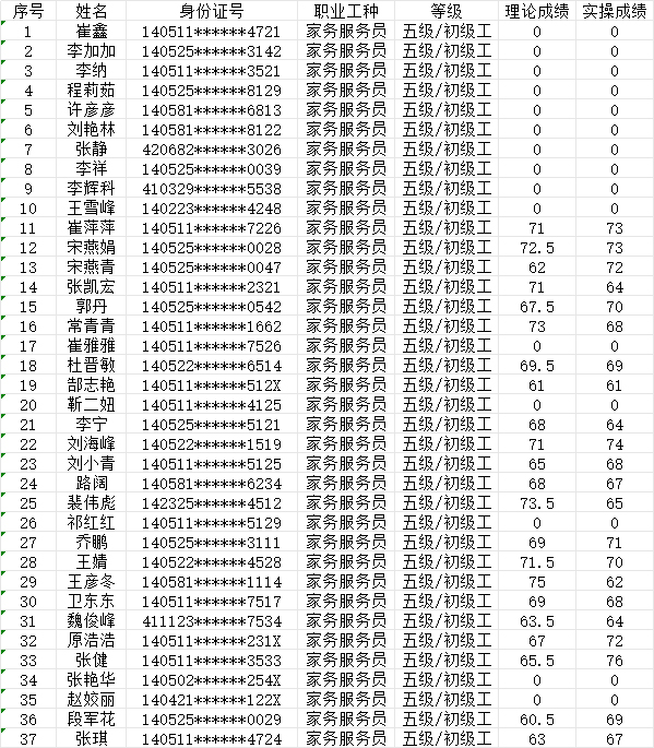 晉城市潔霸清潔服務(wù)股份有限公司職業(yè)技能等級認(rèn)定中心2024年7月21日第24批家政服務(wù)員初級認(rèn)定人員成績公示