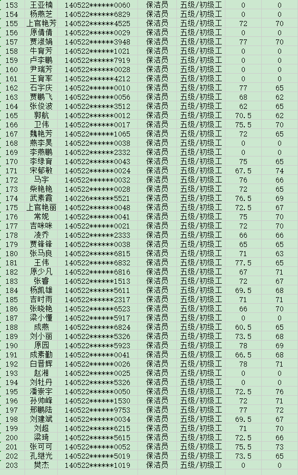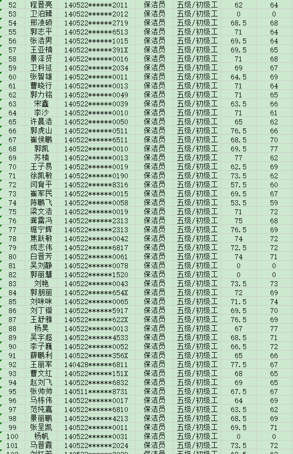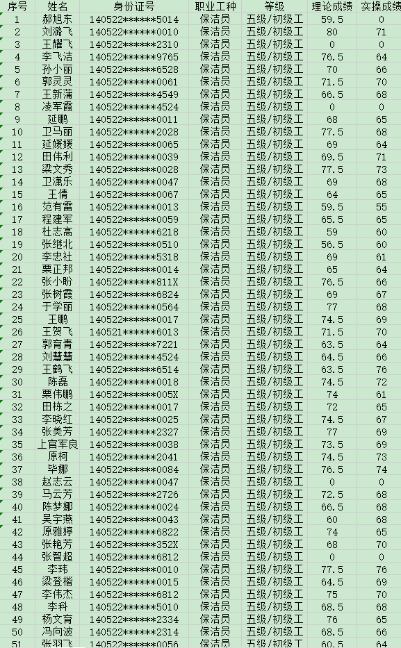 晉城市潔霸清潔服務(wù)股份有限公司職業(yè)技能等級(jí)認(rèn)定中心2024年8月17日第29批保潔員初級(jí)認(rèn)定人員成績(jī)公示