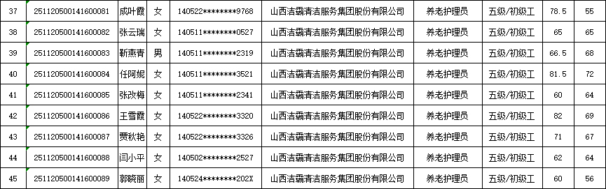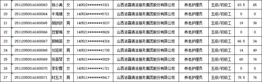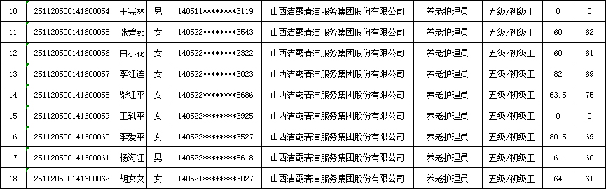 山西潔霸清潔服務集團股份有限公司職業(yè)技能等級認定中心現(xiàn)將2025年11月23日認定人員成績公示如下: